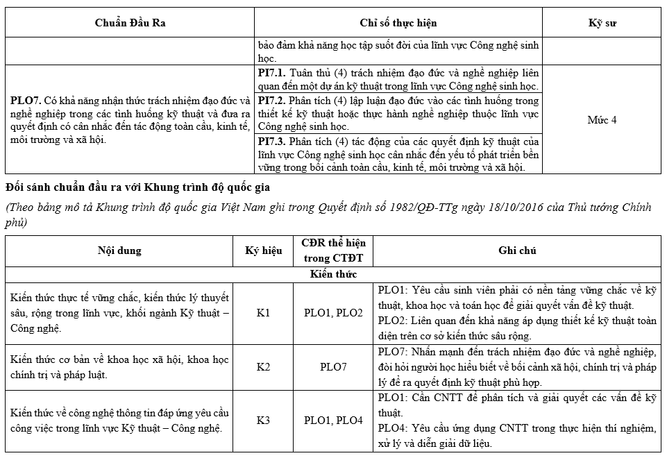 | PLO7 | Có khả năng nhận thức trách nhiệm đạo đức và nghề nghiệp trong các tình huống kỹ thuật và đưa ra quyết định có cân nhắc đến tác động toàn cầu, kinh tế, môi trường và xã hội. | x |