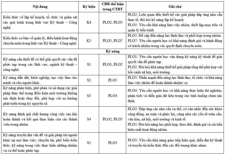 | PLO2 | Có khả năng áp dụng thiết kế kỹ thuật để tạo ra các giải pháp đáp ứng các nhu cầu cụ thể, có cân nhắc đến sức khỏe cộng đồng, an toàn và phúc lợi, cũng như các yếu tố toàn cầu, văn hóa, xã hội, môi trường và kinh tế. | x | x | |