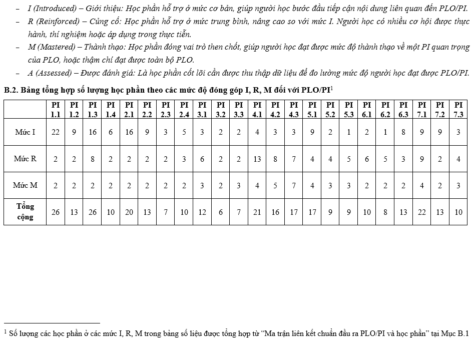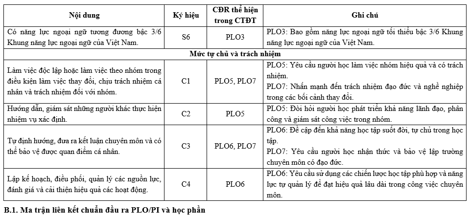Các Chuẩn đầu ra (CĐR) của Chương trình đào tạo (CTĐT) bao gồm CĐR kiến thức, CĐR kỹ năng và CĐR mức tự chủ và trách nhiệm. CĐR bao gồm các mục (1) đến (7) như sau: