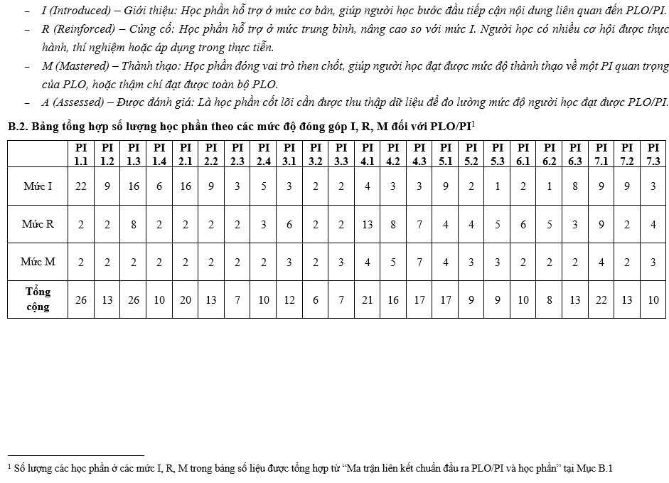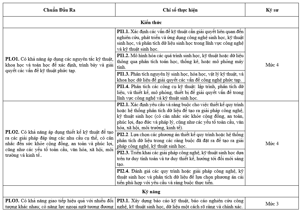 Các Chuẩn đầu ra (CĐR) của Chương trình đào tạo (CTĐT) bao gồm CĐR kiến thức, CĐR kỹ năng và CĐR mức tự chủ và trách nhiệm. CĐR bao gồm các mục (1) đến (7) như sau: