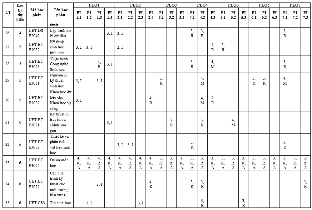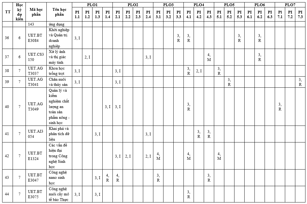 | Mã PLO | Nội dung chuẩn đầu ra | Đối sánh với mục tiêu đào tạo cụ thể | ||
