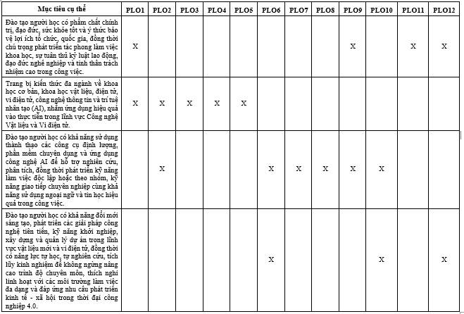 PLO5: Tổng hợp, phân tích và liên kết (4) kiến thức trong các lĩnh vực được đào tạo liên quan tới công nghệ vật liệu và vi điện tử để tham gia nghiên cứu, đánh giá và phát triển các hệ thống, quy trình, sản phẩm kỹ thuật trong lĩnh vực kỹ thuật và công nghệ;