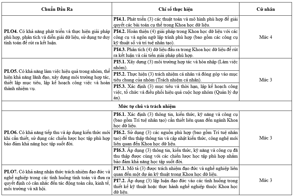| PLO4 | Có khả năng phát triển và thực hiện giải pháp phù hợp, phân tích và diễn giải dữ liệu, sử dụng tư duy tính toán để rút ra kết luận. | x | x | |