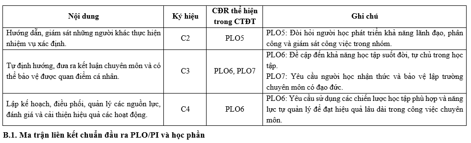 | PLO6 | Có khả năng tiếp thu và áp dụng kiến thức mới khi cần thiết, sử dụng các chiến lược học tập phù hợp bảo đảm khả năng học tập suốt đời. | x | ||