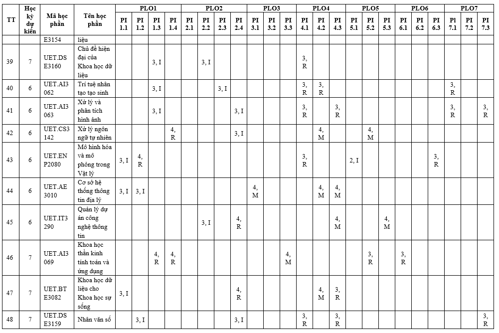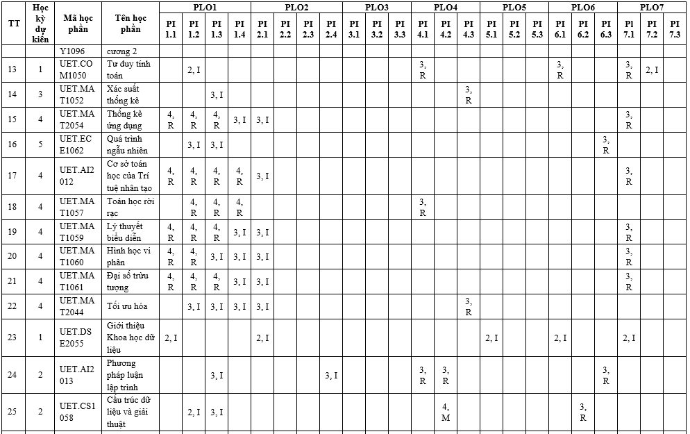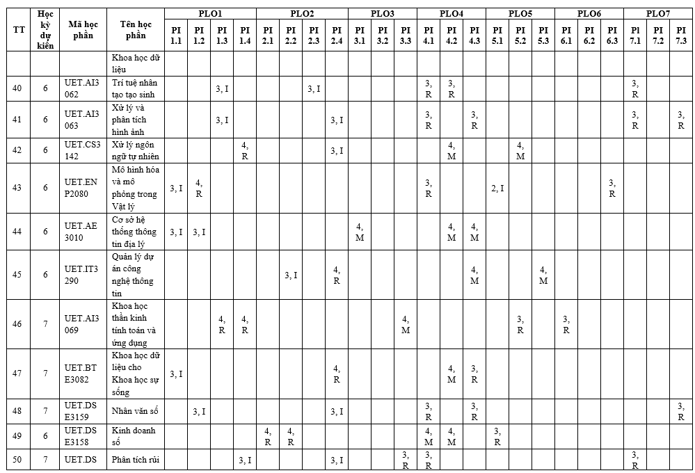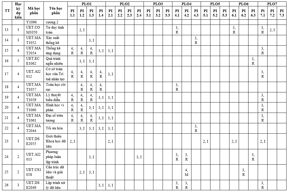 | PLO7 | Có khả năng nhận thức trách nhiệm đạo đức và nghề nghiệp trong các tình huống tính toán và đưa ra quyết định có cân nhắc đến tác động toàn cầu, kinh tế, môi trường và xã hội. | x |