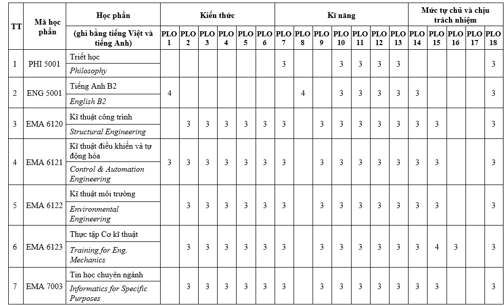 PLO5: Vận dụng tốt kiến thức nâng cao của kỹ thuật cơ điện tử để giải quyết các vấn đề khoa học và kỹ thuật có liên quan;