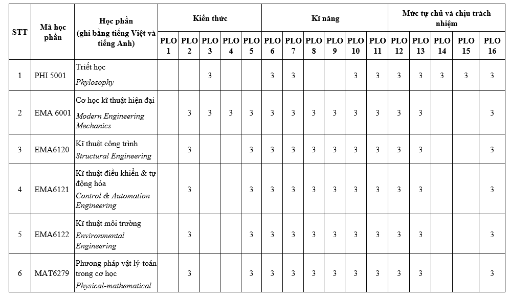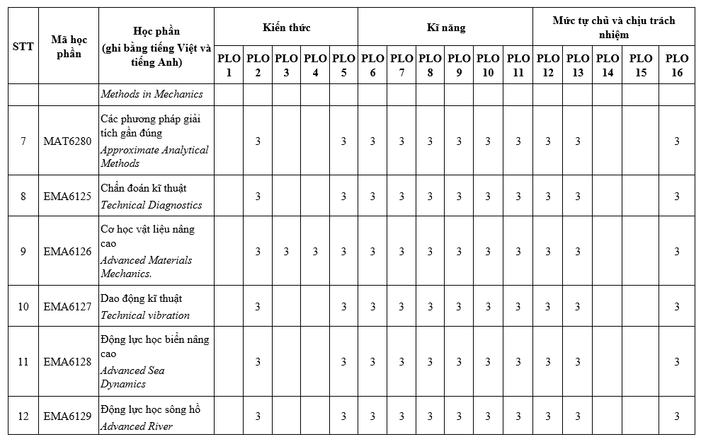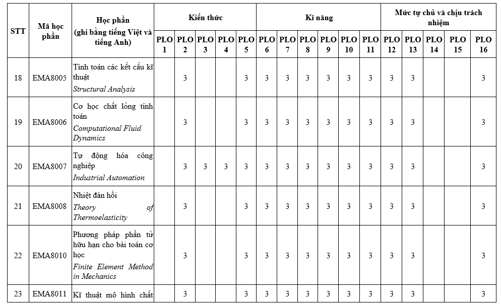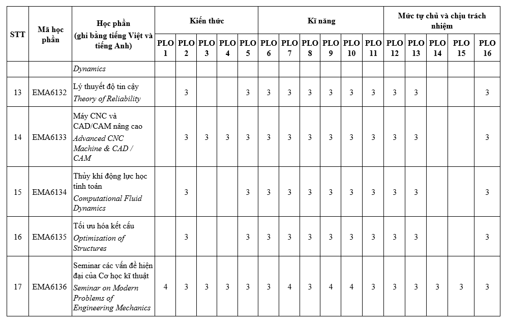 PLO8: Có kỹ năng làm chủ các lý thuyết khoa học, phương pháp, công cụ phục vụ nghiên cứu và phát triển về Cơ kĩ thuật;