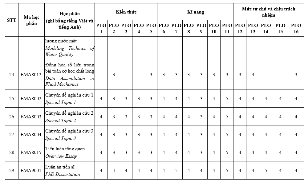 PLO7: Có khả năng trình bày báo cáo khoa học, có kỹ năng thuyết trình, tham gia thảo luận trong nước và quốc tế thuộc lĩnh vực nghiên cứu và phổ biến các kết quả nghiên cứu;