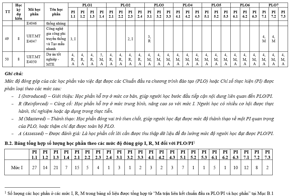 Các Chuẩn đầu ra (CĐR) của Chương trình đào tạo (CTĐT) bao gồm CĐR kiến thức, CĐR kỹ năng và CĐR mức tự chủ và trách nhiệm. CĐR bao gồm các mục (1) đến (7) như sau: