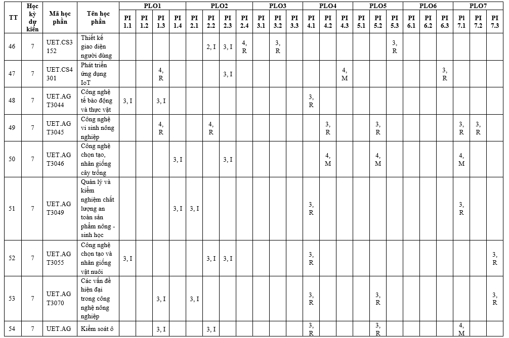| Mã PLO | Nội dung chuẩn đầu ra | Đối sánh với mục tiêu đào tạo cụ thể | ||