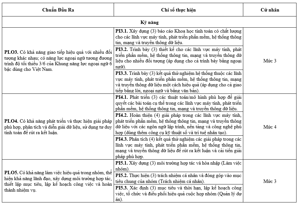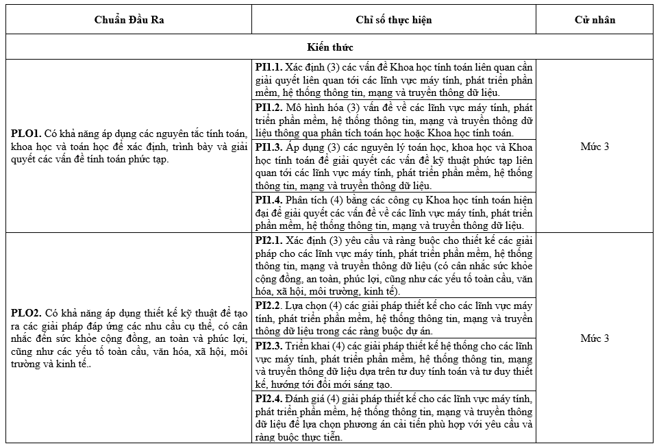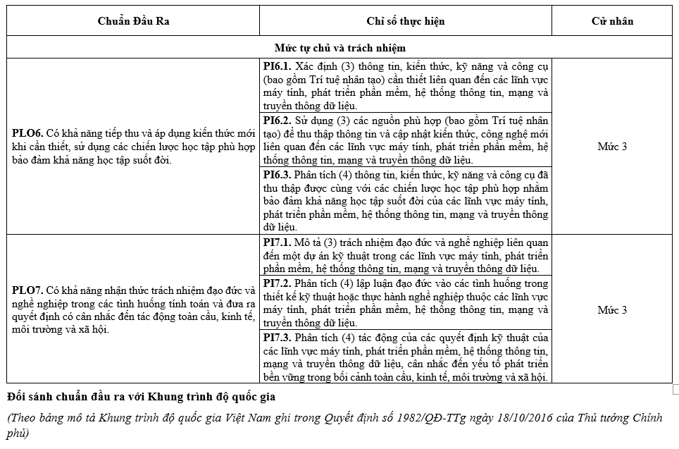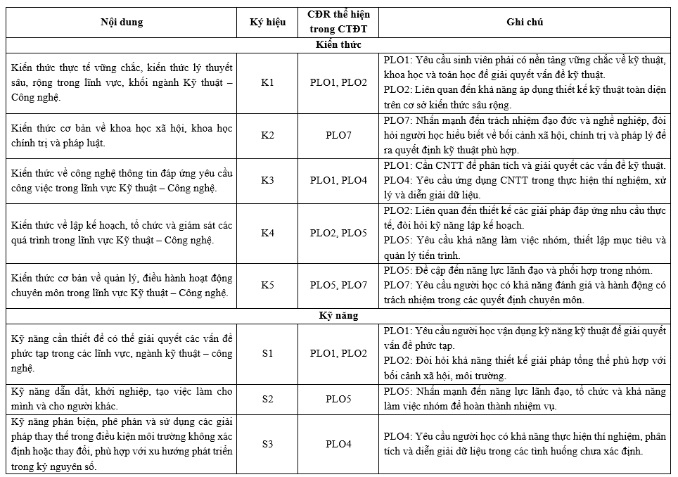 Các Chuẩn đầu ra (CĐR) của Chương trình đào tạo (CTĐT) bao gồm CĐR kiến thức, CĐR kỹ năng và CĐR mức tự chủ và trách nhiệm. CĐR bao gồm các mục (1) đến (7) như sau: