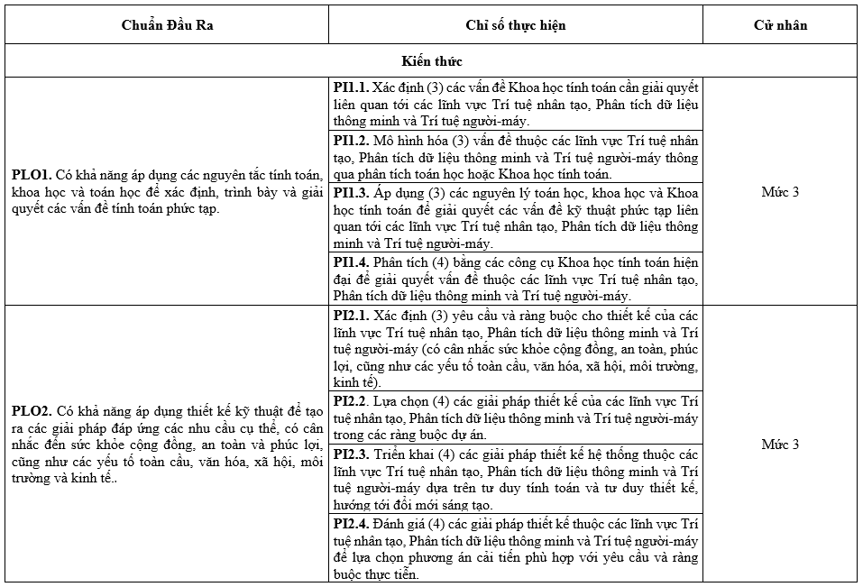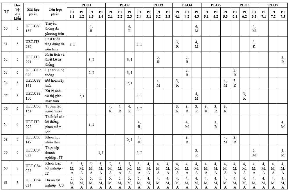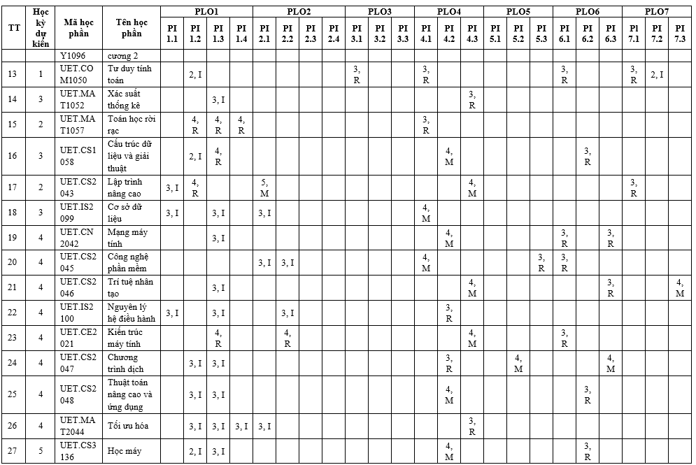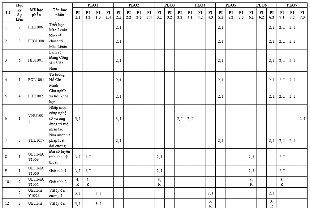 | Mã PLO | Nội dung chuẩn đầu ra | Đối sánh với mục tiêu đào tạo cụ thể | ||