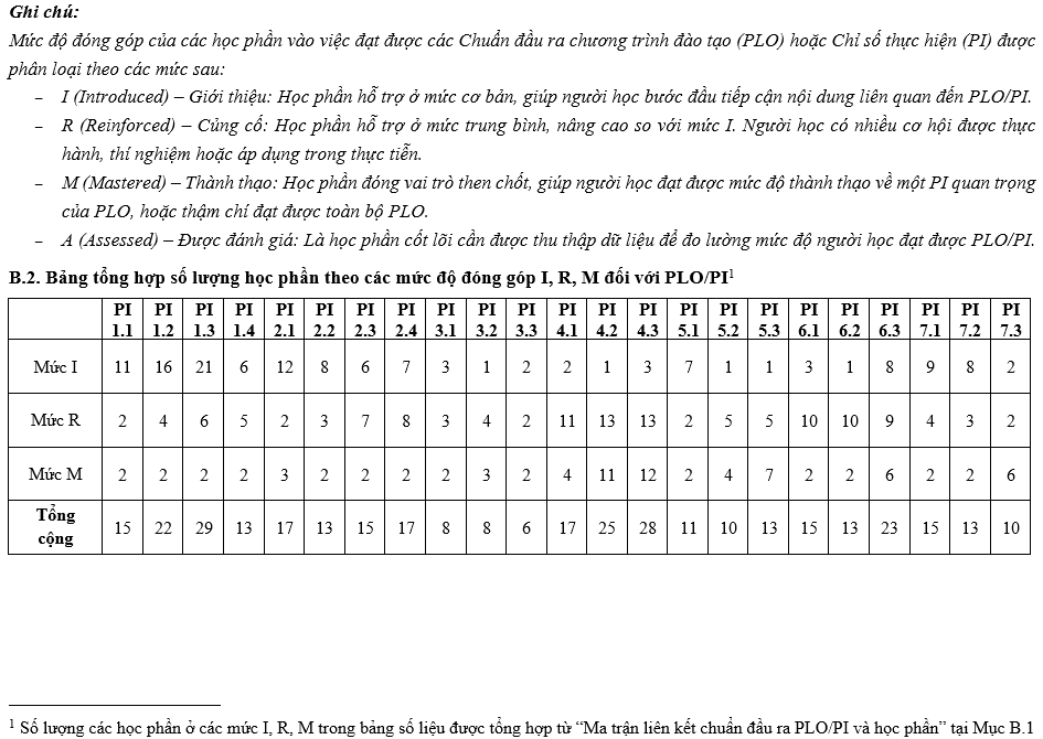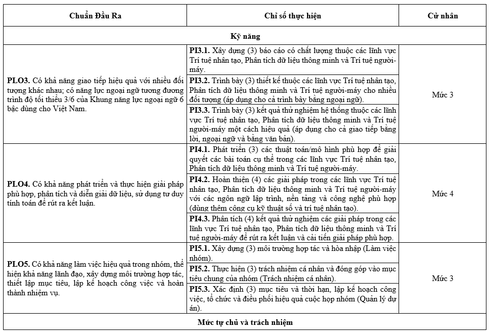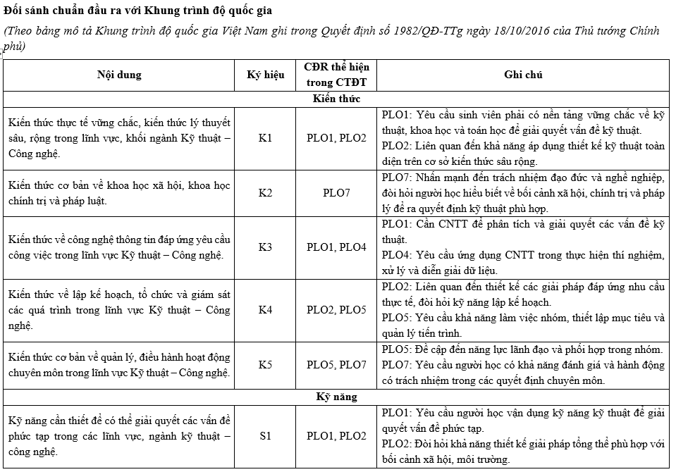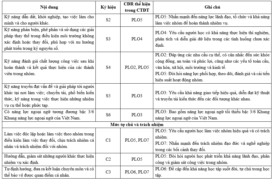 Các Chuẩn đầu ra (CĐR) của Chương trình đào tạo (CTĐT) bao gồm CĐR kiến thức, CĐR kỹ năng và CĐR mức tự chủ và trách nhiệm. CĐR bao gồm các mục (1) đến (7) như sau: