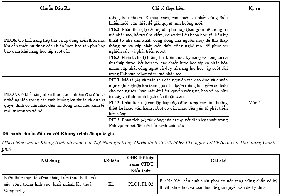 Các Chuẩn đầu ra (CĐR) của Chương trình đào tạo (CTĐT) bao gồm CĐR kiến thức, CĐR kỹ năng và CĐR mức tự chủ và trách nhiệm. CĐR bao gồm các mục (1) đến (7) như sau: