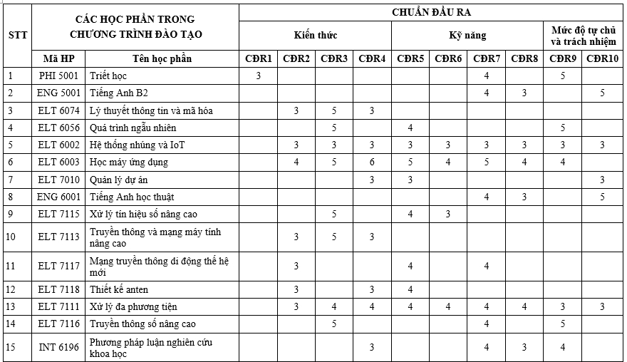 PLO3: Tổng hợp được các kiến thức chuyên ngành nâng cao và tiên tiến, phương pháp luận nghiên cứu khoa học để đánh giá và đề xuất các giải pháp thuộc ngành Kỹ thuật viễn thông;