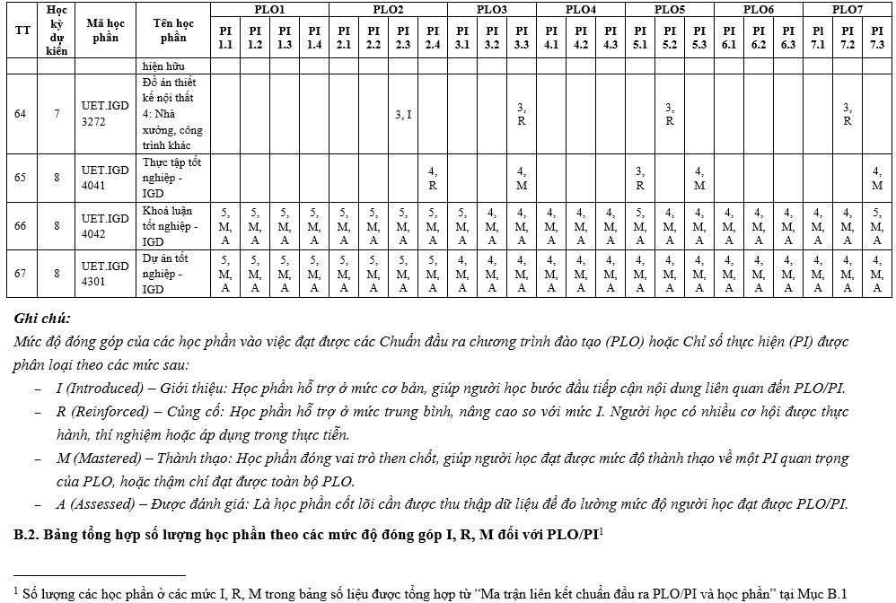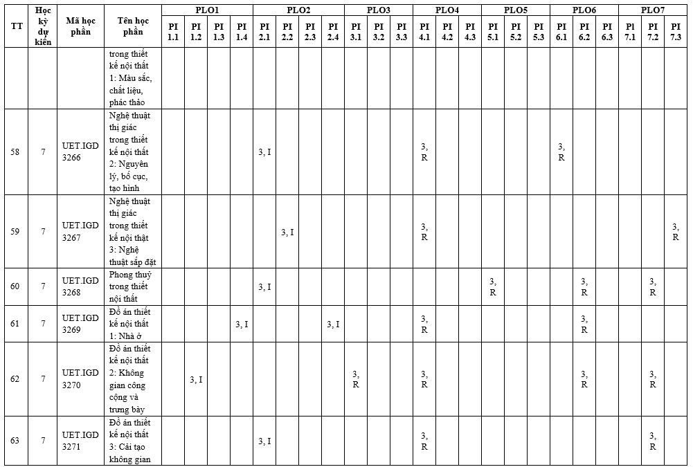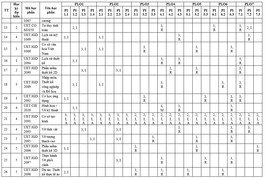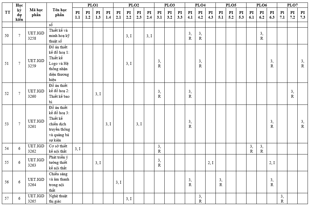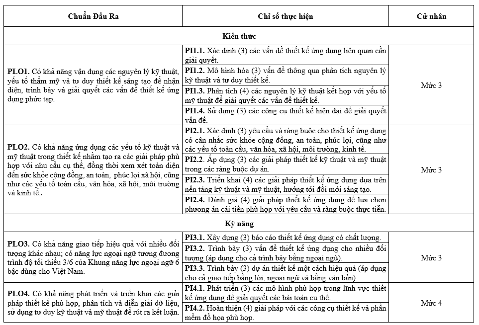 | PLO2 | Có khả năng ứng dụng các yếu tố kỹ thuật và mỹ thuật trong thiết kế nhằm tạo ra các giải pháp phù hợp với nhu cầu cụ thể, đồng thời xem xét toàn diện đến sức khỏe cộng đồng, an toàn, phúc lợi xã hội, cũng như các yếu tố toàn cầu, văn hóa, xã hội, môi trường và kinh tế. | x | x | |