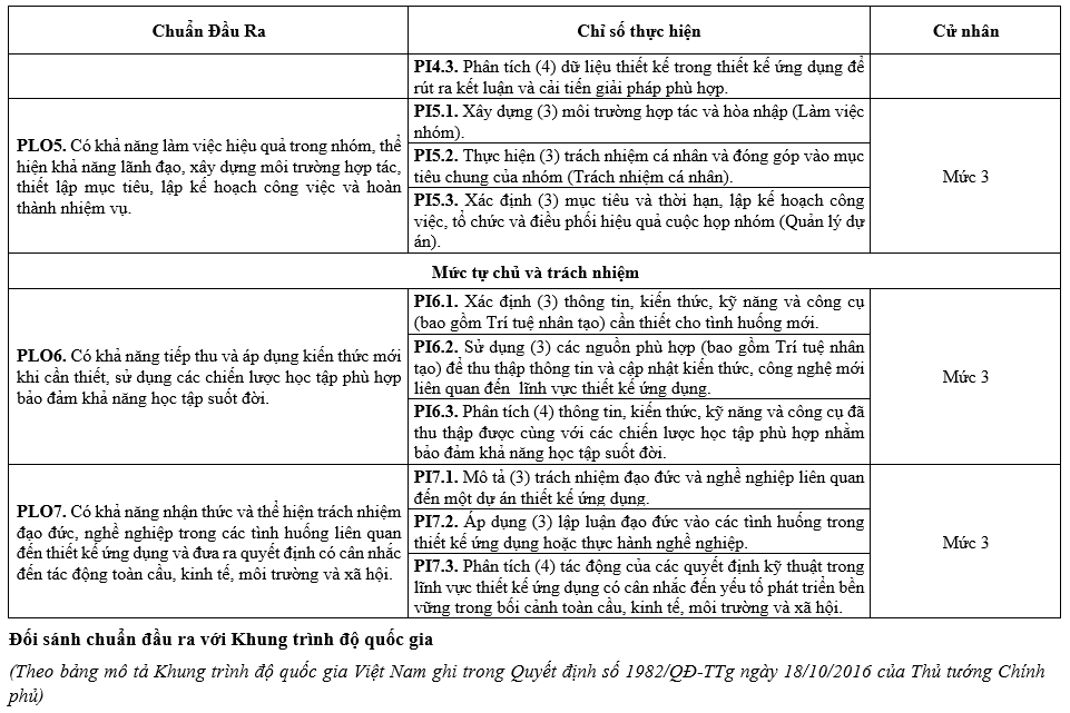 | PLO7 | Có khả năng nhận thức và thể hiện trách nhiệm đạo đức, nghề nghiệp trong các tình huống liên quan đến thiết kế ứng dụng và đưa ra quyết định có cân nhắc đến tác động toàn cầu, kinh tế, môi trường và xã hội. |