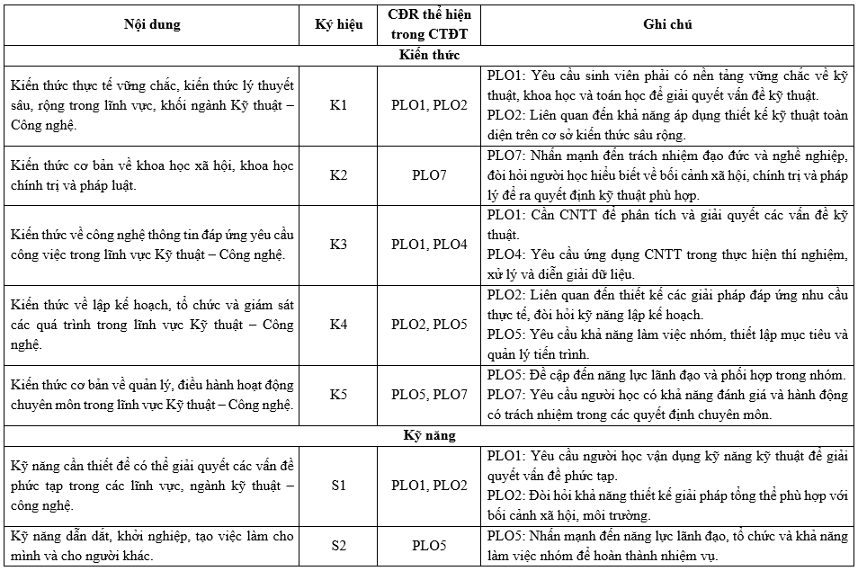 Các Chuẩn đầu ra (CĐR) của Chương trình đào tạo (CTĐT) bao gồm CĐR kiến thức, CĐR kỹ năng và CĐR mức tự chủ và trách nhiệm. CĐR bao gồm các mục (1) đến (7) như sau: