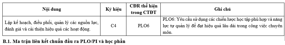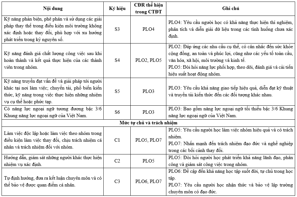 | PLO6 | Có khả năng tiếp thu và áp dụng kiến thức mới khi cần thiết, sử dụng các chiến lược học tập phù hợp bảo đảm khả năng học tập suốt đời. | x | ||