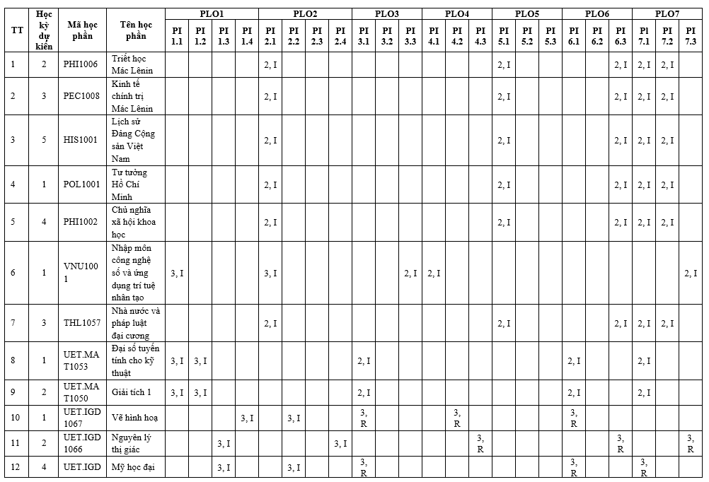 | Mã PLO | Nội dung chuẩn đầu ra | Đối sánh với mục tiêu đào tạo cụ thể | ||