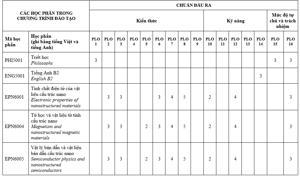 PLO6. Học viên vận dụng được kiến thức về công nghệ chế tạo vật liệu và linh kiện cấu trúc Micro và Nano, các phương pháp tính toán trong vật lý và khoa học vật liệu nâng cao trong thực hành và nghiên cứu;