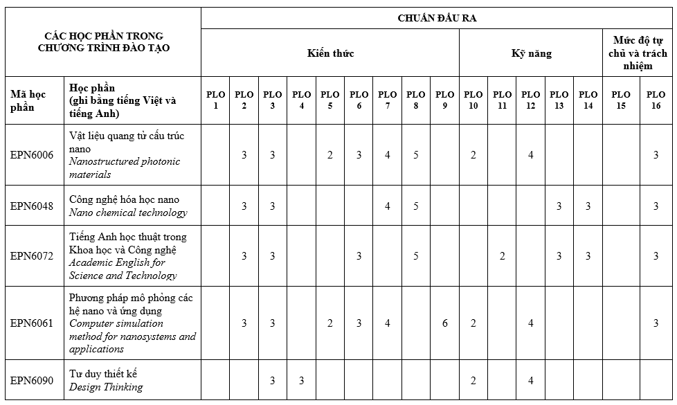PLO3. Vận dụng kiến thức ngành, liên ngành trong lĩnh vực Vật liệu và Linh kiện nano như Vật lý, Toán học, Tin học, Hóa học, Khoa học và Công nghệ micro-nano, Khoa học vật liệu để giải quyết các vấn đề trong lĩnh vực ngành/chuyên ngành;