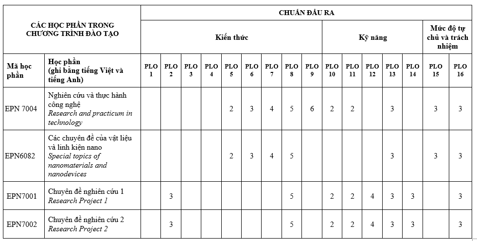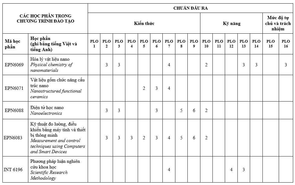 PLO7. Học viên có kiến thức trong phân tích kết quả quá trình nghiên cứu thực nghiệm và lý thuyết trong lĩnh vực vật liệu và linh kiện nano và các lĩnh vực liên quan như năng lượng môi trường;