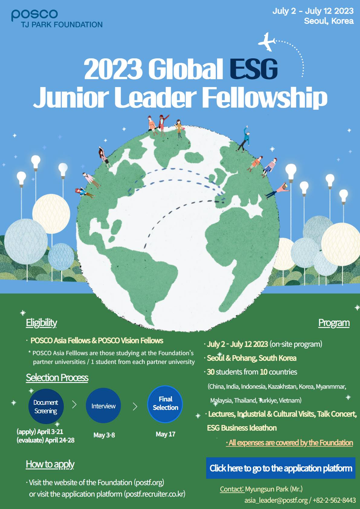 Thông tin chi tiết liên quan đến chương trình xem tài liệu Global ESG Junior Leader Fellowship Implementation Plan; Global ESG Junior Leader Fellowship_Schedule for Interview (proposed) hoặc liên hệ trực tiếp với cán bộ của Quỹ Posco: Mr. Myungsun Park, Emai: asia_leader@postf.org, điện thoại: +82-2-562-8443.