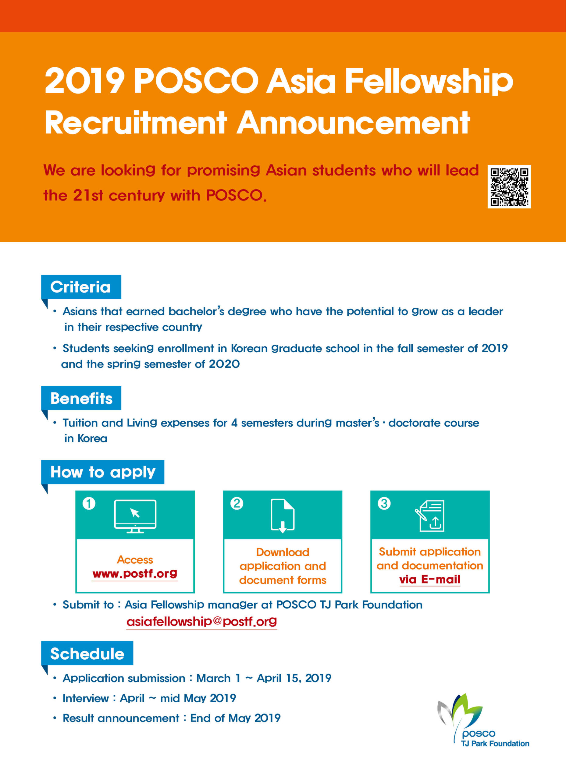 ĐHQGHN gửi thông tin về chương trình học bổng du học Hàn Quốc “Posco Fellowship 2019” dành cho cựu sinh viên của ĐHQGHN. Ứng viên xem thông tin về chương trình, tải mẫu đăng ký tại địa chỉ: http://www.postf.org và gửi hồ sơ đăng ký tới địa chỉ email: asiafellowship@postf.org.