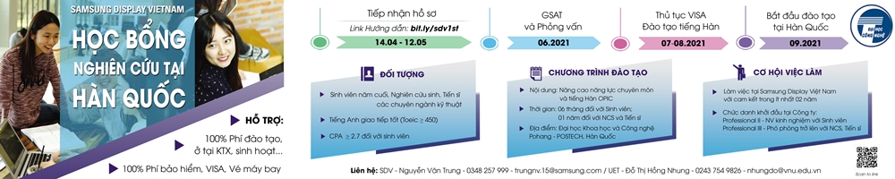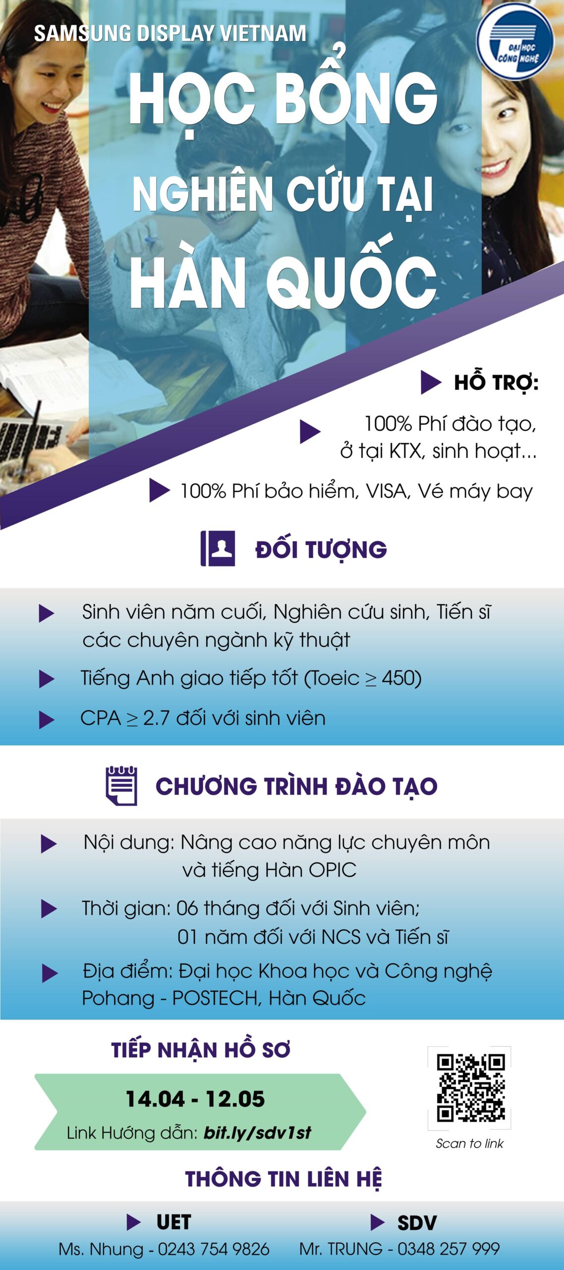 Chương trình học bổng nghiên cứu tại Hàn Quốc -“PSDP-V Program” cho sinh viên là chương trình học bổng hợp tác giữa Công ty Samsung Display (SDC), Công ty Samsung Display Việt Nam (SDV), Trường Đại học Công nghệ – ĐHQG Hà Nội (UET-VNU) và Trường Đại học Khoa học và Công nghệ Pohang (POSTECH), Hàn Quốc nhằm hỗ trợ các bạn sinh viên năm cuối của UET đi trao đổi nghiên cứu tại POSTECH bằng nguồn tài trợ của SDV.
