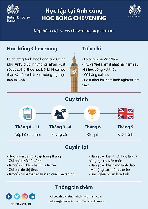 Với những vấn đề khác liên quan đến Chevening, ứng viên có thể liên hệ với Ban Điều phối Học bổng Chevening qua địa chỉ chevening.vietnam@ukinvietnam.com.