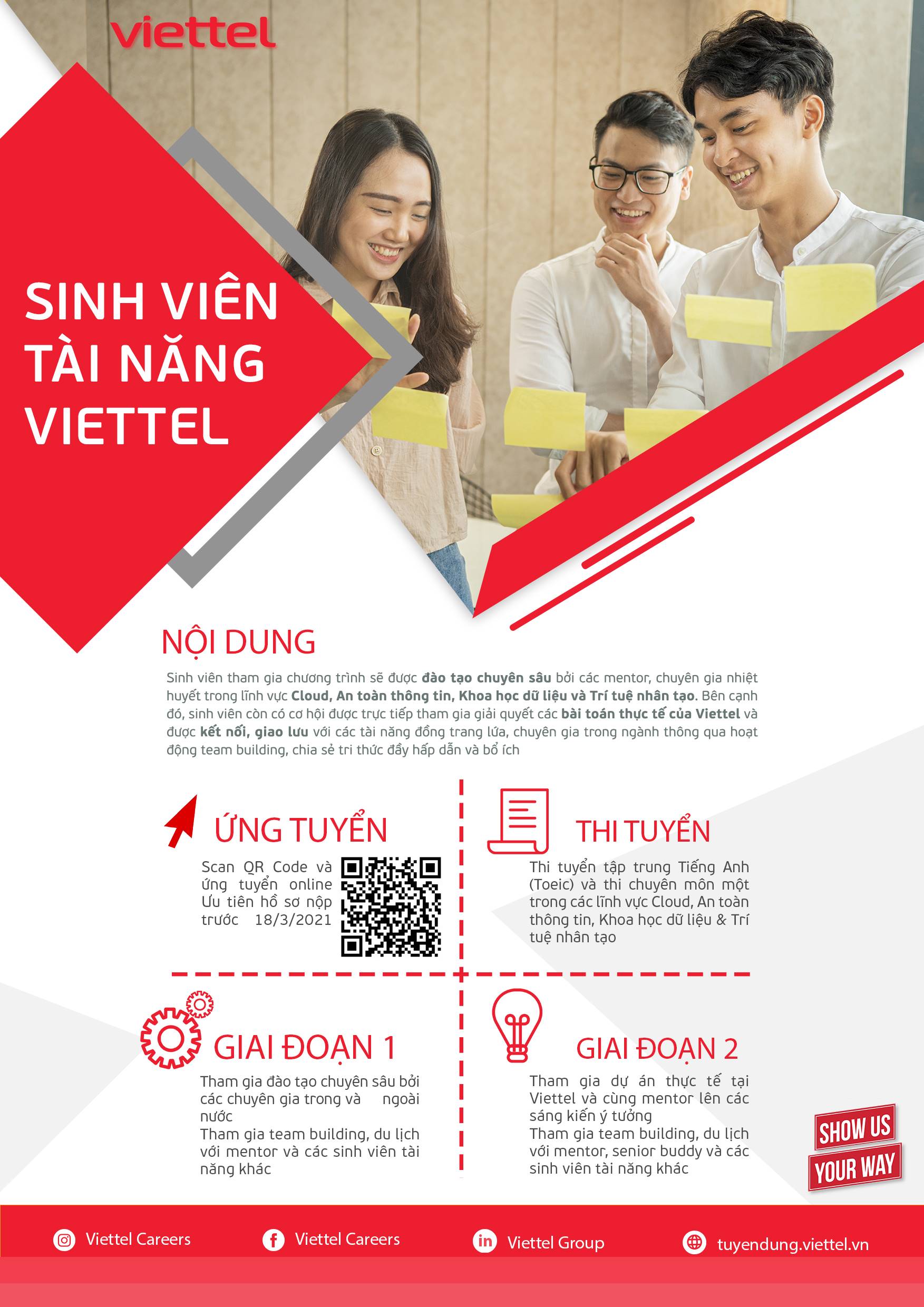 - Tạo hồ sơ và trực tiếp ứng tuyển tại website: https://tuyendung.viettel.vn/VRS_FE/recruitment-information/detail/14263
