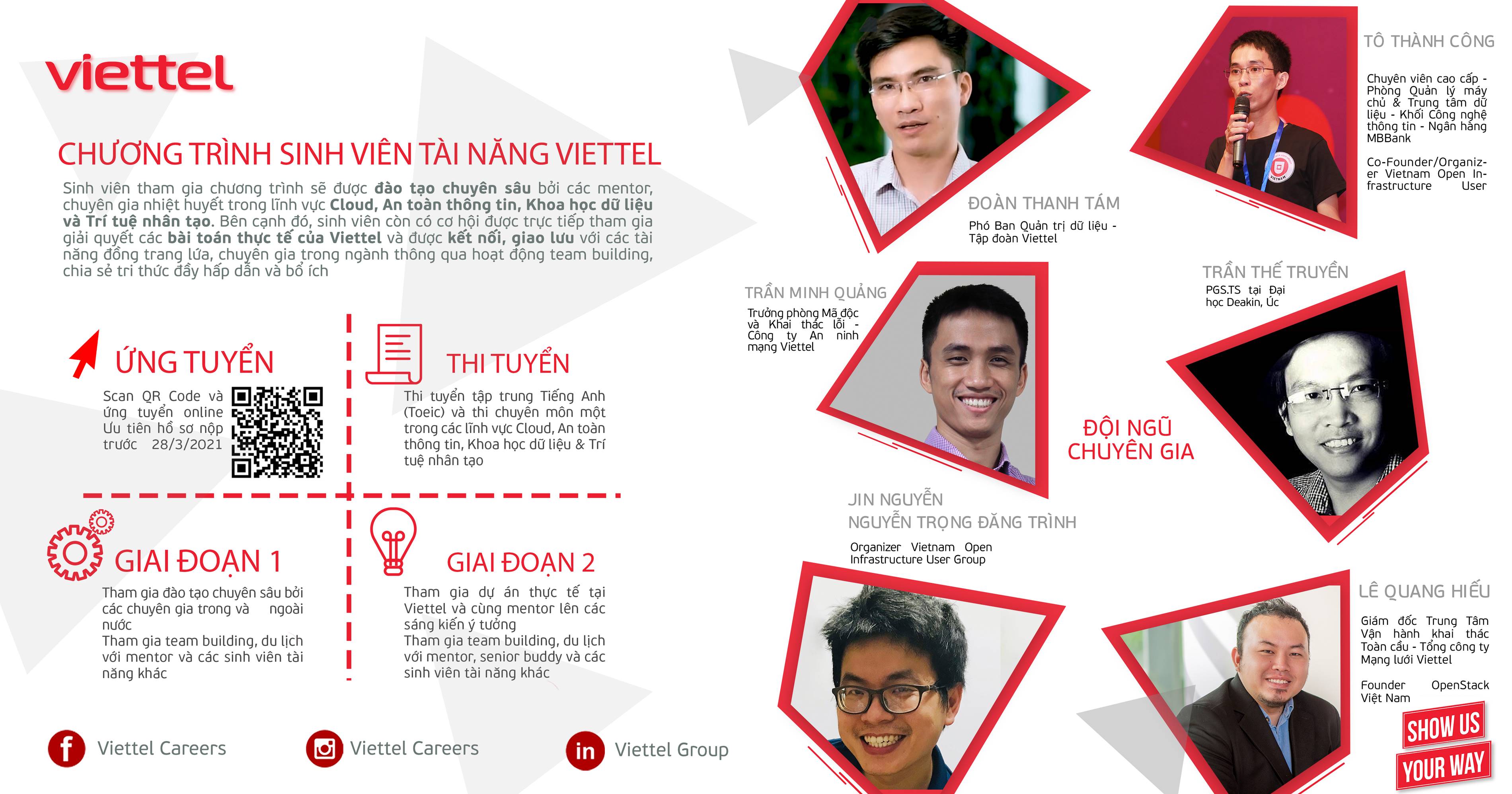 - Sinh viên được tham gia các buổi đào tạo, chia sẻ, đinh hướng của đội ngũ chuyên gia hàng đầu của Viettel, trong và ngoài nước trong lĩnh vực Cloud, An toàn thông tin, Khoa học dữ liệu & Trí tuệ nhân tạo của Viettel