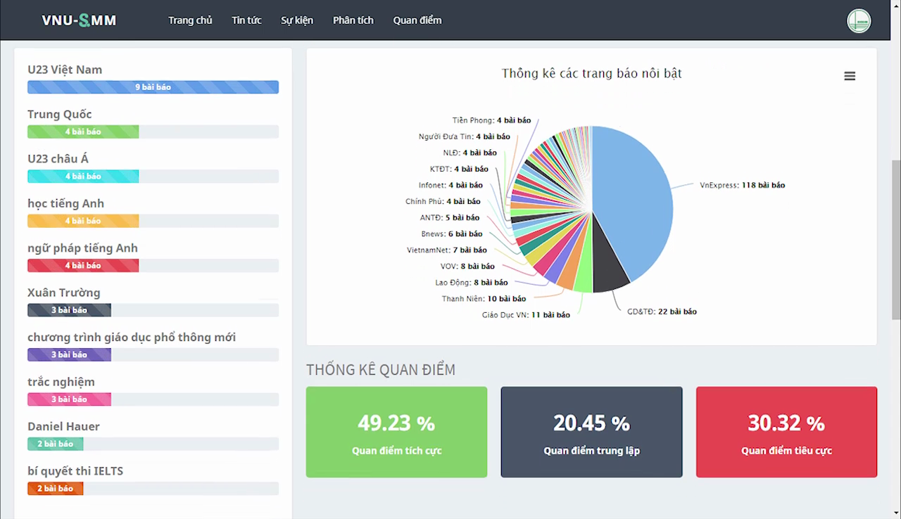 Giao diện “Hệ thống tự động phân tích dữ liệu truyền thông xã hội trực tuyến phục vụ quản lý và hỗ trợ ra quyết định trong kinh tế, chính trị, giáo dục và xã hội”