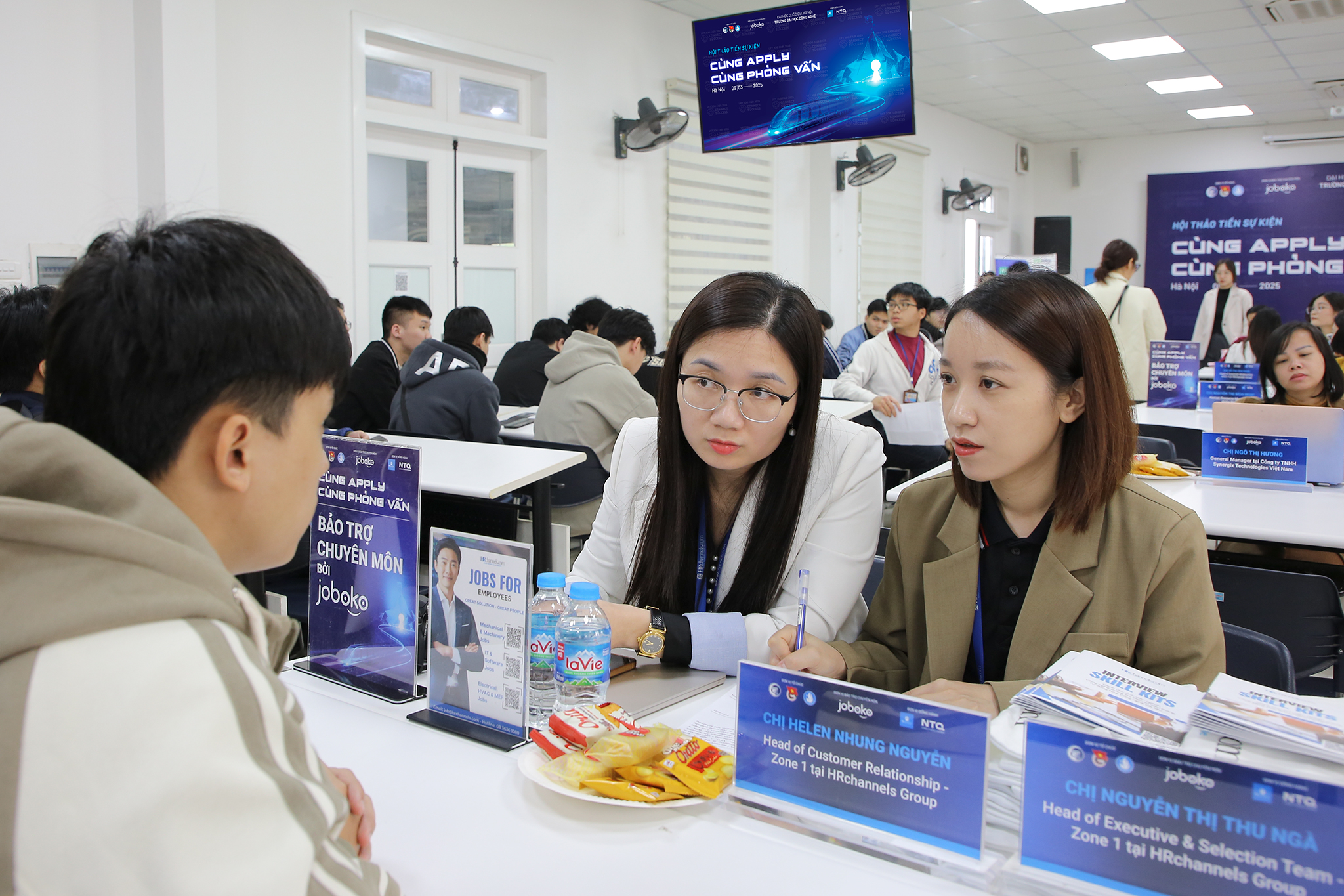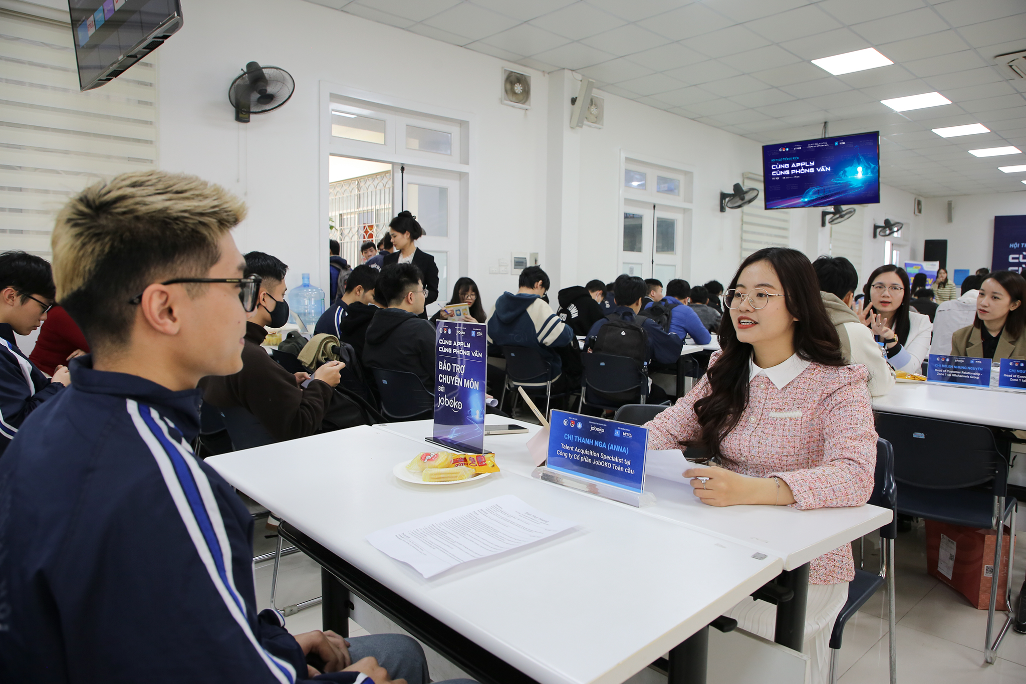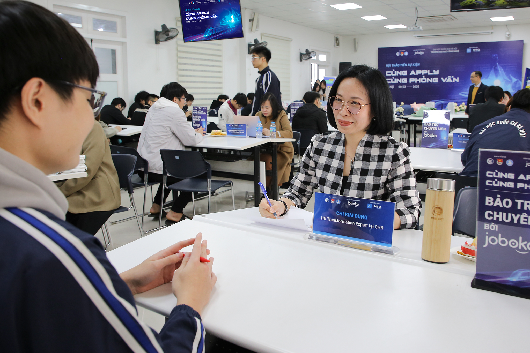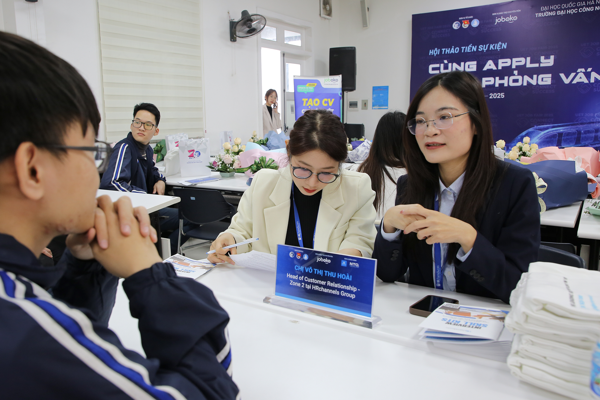 Hội thảo “Cùng apply – Cùng phỏng vấn” diễn ra với 3 hoạt động chính: Review CV, Mock Interview và phỏng vấn tuyển dụng trực tiếp với doanh nghiệp. Đây là hoạt động nằm trong chuỗi sự kiện UET Job Fair 2025, dưới sự bảo trợ chuyên môn của nền tảng công nghệ tuyển dụng JobOKO, nhằm trang bị kỹ năng viết CV xin việc, phỏng vấn, tìm việc làm dành riêng cho các bạn sinh viên UET.