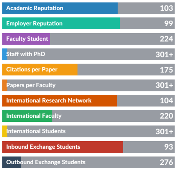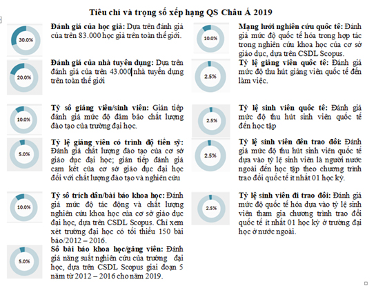Ngoài 10 chỉ số đánh giá như mọi năm (đánh giá của các nhà tuyển dụng; đánh giá của các nhà khoa học; tỷ lệ giảng viên trên sinh viên; tỷ lệ giảng viên có trình độ tiến sĩ; số lượng bài báo và trích dẫn theo CSDL của Scopus; giảng viên và sinh viên quốc tế; trao đổi sinh viên Việt nam và quốc tế), lần đầu tiên QS đưa thêm 2 điểm mới trong các tiêu chí xếp hạng của QS đối với bảng xếp hạng QS Châu Á năm 2019, đó là: chỉ số về mạng lưới nghiên cứu quốc tế (International Research Network) với trọng số 10%. Chỉ số này được tính thông qua số lượng, tỷ lệ những công bố khoa học trên hệ thống cơ sở dữ liệu Scopus có đồng tác giả là học giả quốc tế, qua đó giúp đánh giá số lượng và sự đa dạng trong quốc tế hóa nghiên cứu; thứ 2 là việc khảo sát đối với học giả và nhà tuyển dụng có điều chỉnh trong việc chọn lọc và phân tích dữ liệu, với số học giả và nhà tuyển dụng tham gia khảo sát tăng 38% so với năm trước.