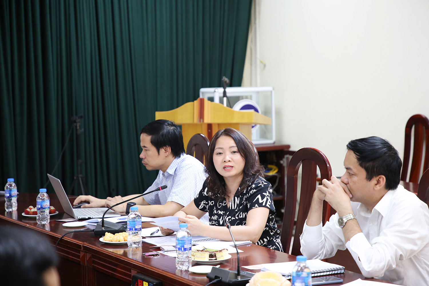 Đồng chí Lê Thị Phương Thoa (giữa) – Bí thư Chi bộ trình bày Báo cáo tự kiểm điểm của Chi ủy Chi bộ Hiệu bộ nhiệm kỳ 2022-2022 và đồng chí Nguyễn Phương Thái (bên trái) – Phó Bí thư Chi bộ trình bày báo cáo tổng kết công tác của Chi bộ nhiệm kì 2020 – 2022 và phương hướng nhiệm vụ nhiệm kỳ 2022 – 2025