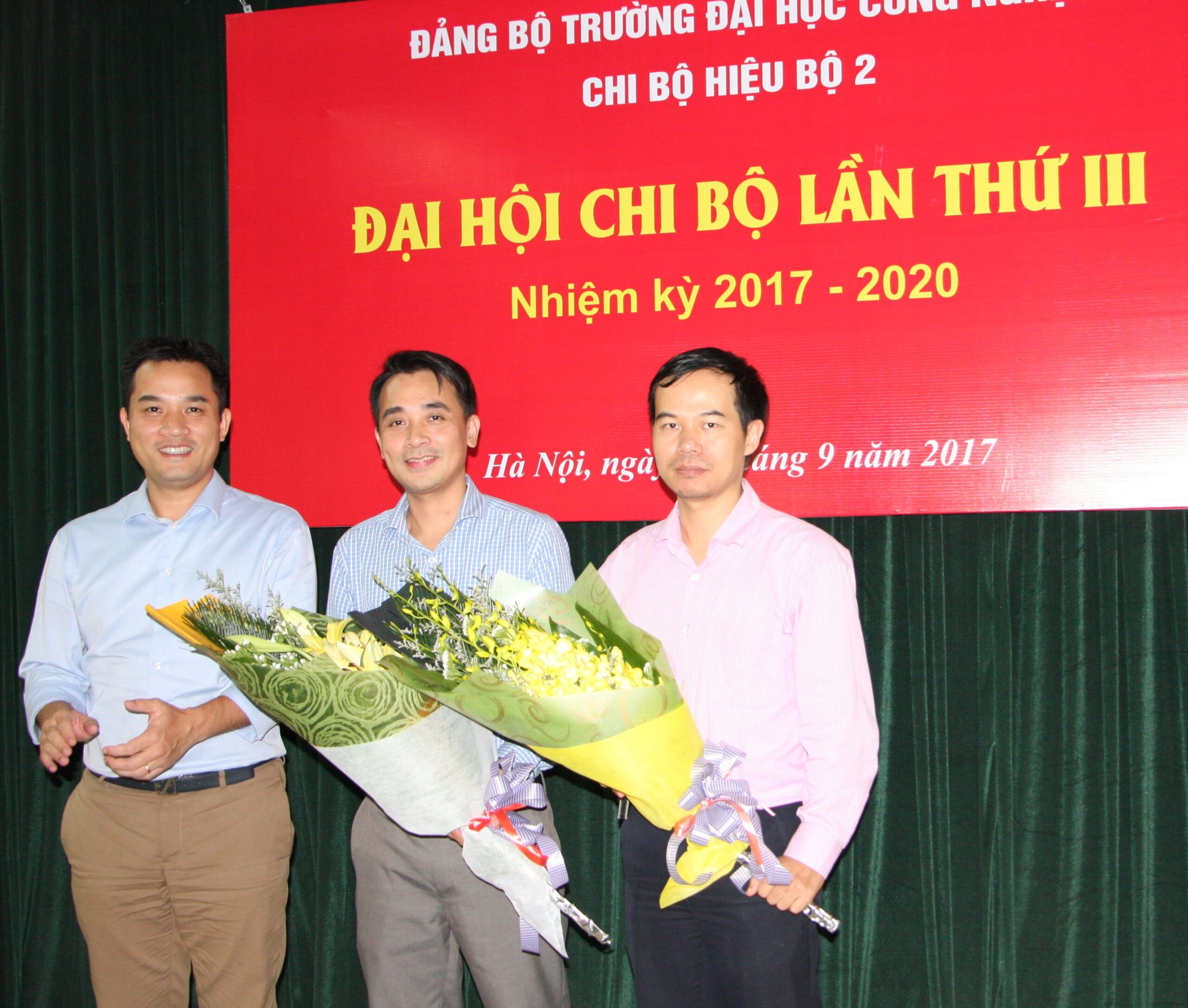 PGS. TS. Phạm Bảo Sơn – Bí thư Đảng ủy (đứng thứ ba, bên trái ảnh) và PGS.TS. Nguyễn Việt Hà – Hiệu trưởng Nhà trường (đứng thứ hai, bên phải ảnh) tham dự và chúc mừng Đại hội chi bộ Hiệu bộ 2 diễn ra vào ngày 13/09/2017