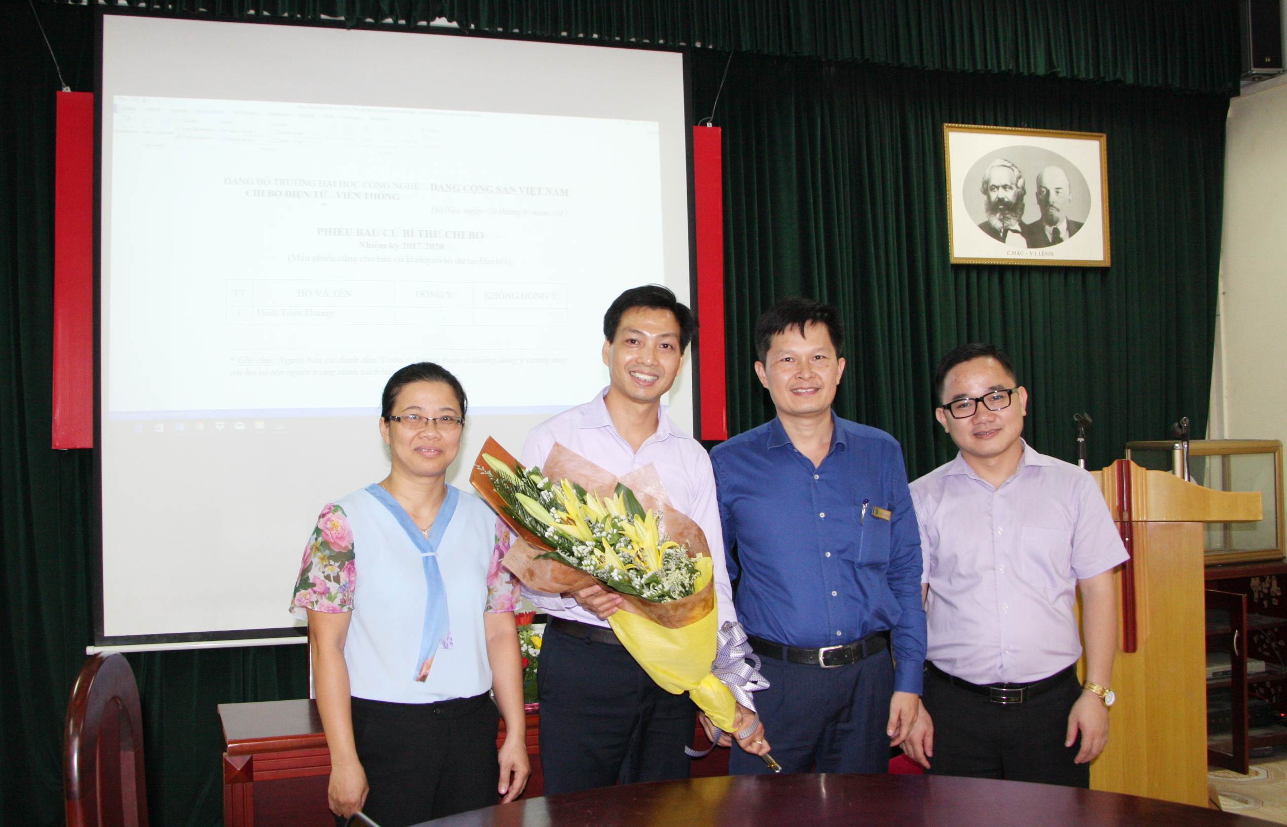 TS. Nguyễn Anh Thái (đứng thứ hai bên phải ảnh) tới dự và chúc mừng TS. Đinh Triều Dương được bầu giữ chức vụ Bí thư chi bộ, PGS.TS. Trần Đức Tân được bầu giữ chức vụ Phó Bí thư và ThS. Nguyễn Thị Thanh Vân giữ chức vụ Chi ủy viên chi bộ Điện tử viễn thông nhiệm kỳ 2017-2020