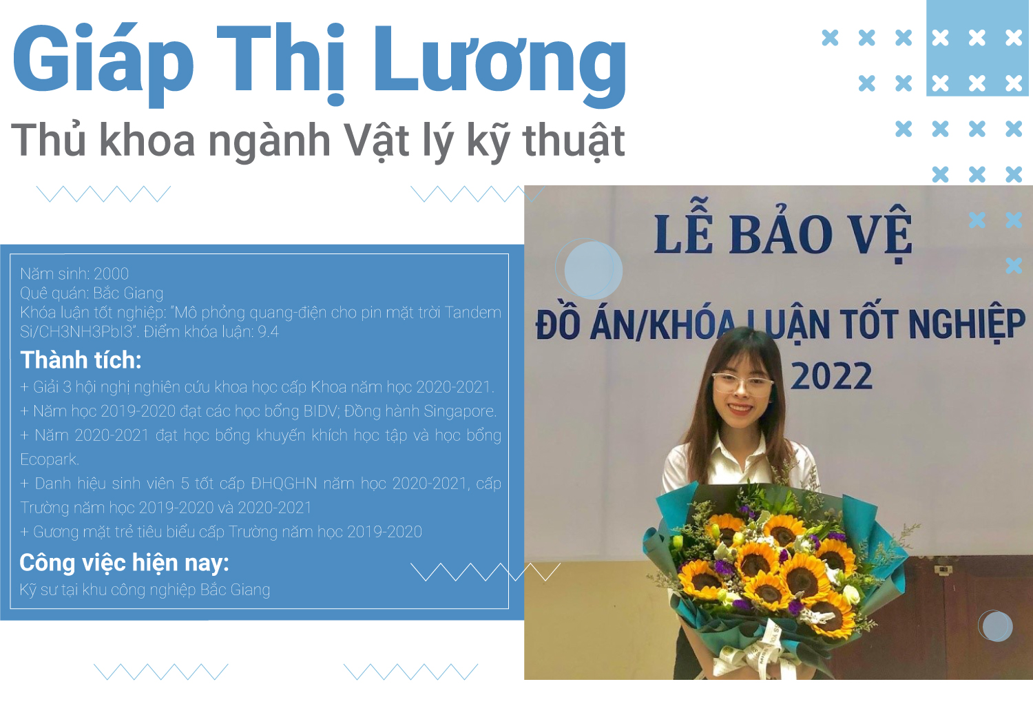 Suốt 4 năm học tập tại Trường Đại học Công nghệ (Đại học Quốc gia Hà Nội), Giáp Thị Lương luôn phấn đấu để đạt học bổng và trở thành thủ khoa tốt nghiệp khóa QH-2018-I/CQ. Đến nay, Lương không làm gia đình, bạn bè thất vọng khi cô gái nhỏ ngành Vật lý kỹ thuật (Khoa Vật lý kỹ thuật và công nghệ nano) “vượt qua” các bạn cùng khóa trở thành Thủ khoa tốt nghiệp ngành.