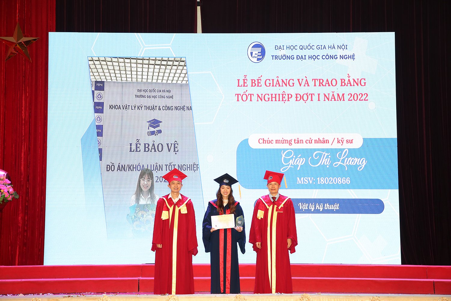 Không giống như các bạn trẻ khác chọn lựa ở lại Hà Nội lập nghiệp, Giáp Thị Lương trở về vùng đất quê hương Bắc Giang, nơi gắn bó với tuổi thơ để phát triển tương lai. Có lẽ sự lựa chọn của Lương cũng chính là một trong những lý do khiến em quyết tâm giành học bổng và đạt thành tích trong học tập, nghiên cứu, Lương chia sẻ: “Gia đình em có 3 chị em, bố mẹ em chủ yếu ở nhà làm nông, trồng cây ăn quả như bao hộ gia đình khác tại tỉnh Bắc Giang. Vì vậy, để nuôi em học 4 năm đại học, bố mẹ đã làm lụng rất vất vả. Em luôn tự nhủ phải cố gắng học tập thật tốt, đạt nhiều thành tích để báo đáp công ơn sinh thành dưỡng dục của bố mẹ. Có lẽ đó cũng là động lực để 4 năm học tập em “đam mê” săn học bổng. Mặc dù số tiền học bổng không nhiều, nhưng cũng đã giảm bớt một phần gánh nặng học phí cho bố mẹ, để bố mẹ tự hào về em. Ngoài ra, động lực giúp em học tập còn là kỷ niệm ngay từ năm thứ nhất trong buổi gặp mặt sinh viên lần đầu tiên của Ban chấp hành Khoa Vật lý kỹ thuật và Công nghệ nano, các thầy/cô đã thưởng cho 2 bạn thủ khoa đầu vào. Lúc đó, em đã tự nhủ rằng mình phải trở thành thủ khoa tốt nghiệp. Để đạt được điều đó, em bắt đầu lập kế hoạch học tập, sắp xếp thời gian hợp lý giữa việc học và các hoạt động ngoại khóa nhằm nâng cao kiến thức và kỹ năng sống, đồng thời em giảm thiểu những hoạt động không cần thiết và tập trung 100% vào việc học tập. Bên cạnh đó, em cũng chủ động liên hệ với các thầy/cô trong khoa để được trở thành những sinh viên nghiên cứu khoa học, điều mà em luôn mong ước. Với những kiến thức chuyên sâu tiếp thu được trong quá trình tham gia nghiên cứu khoa học, đồng thời với thế mạnh của bản thân là sự chăm chỉ, luôn chú ý lắng nghe và ghi chép đầy đủ các bài giảng trên lớp, ham học hỏi từ các anh chị đi trước, quá trình học tập của em trở nên thú vị và dễ dàng hơn bao giờ hết”.