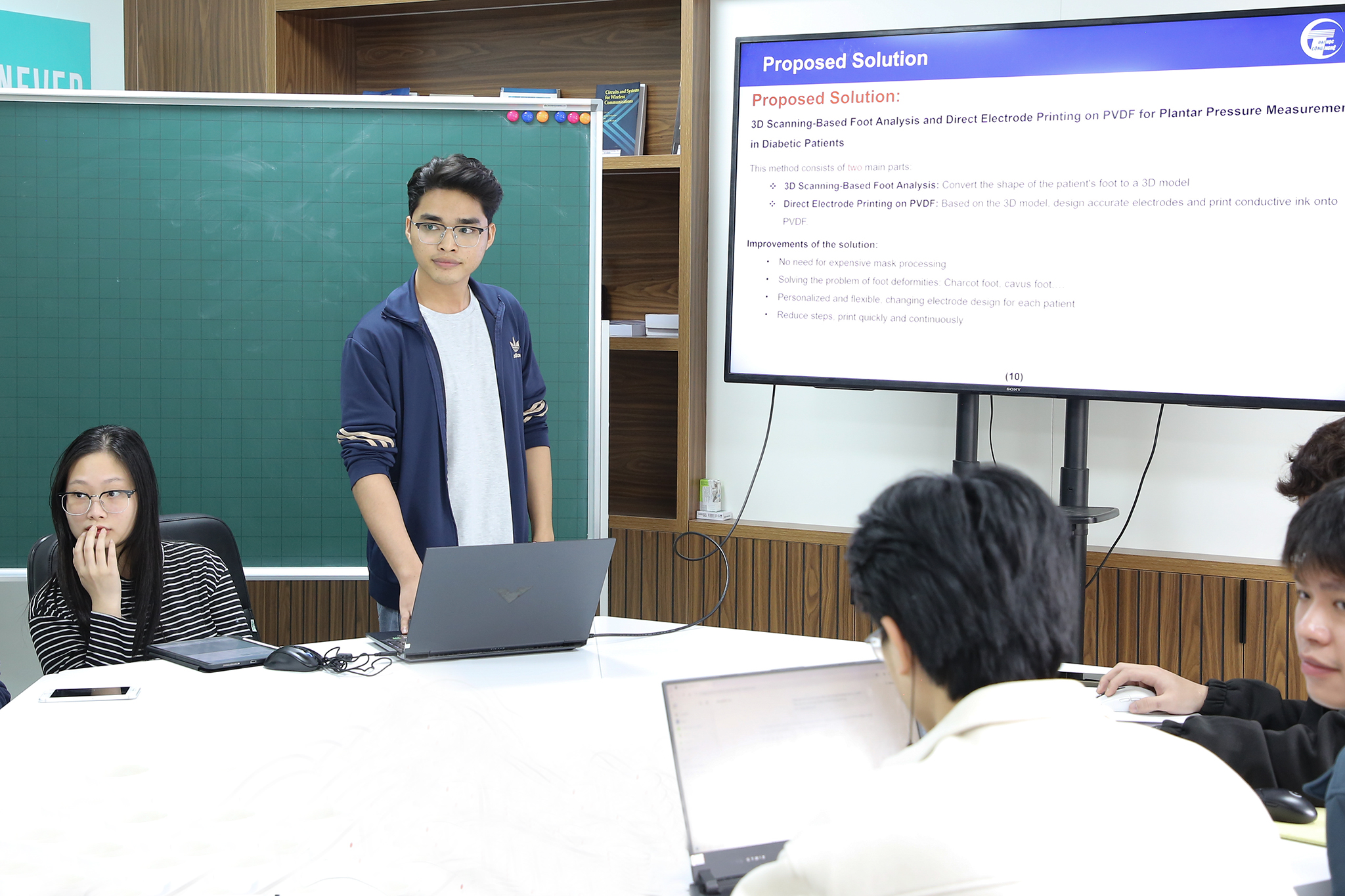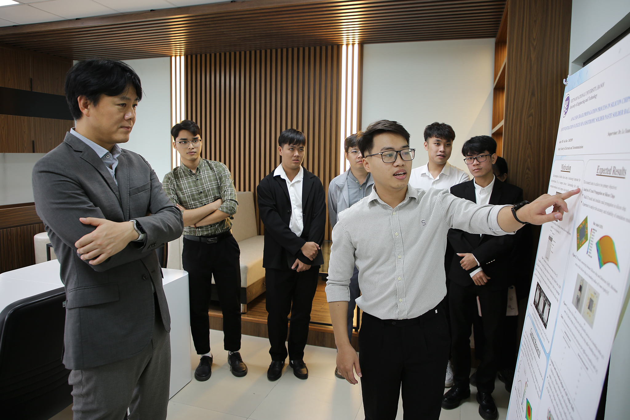 Học viên Phí Văn Hòa trình bày kết quả nghiên cứu với đại diện Samsung Electronics, Hàn Quốc