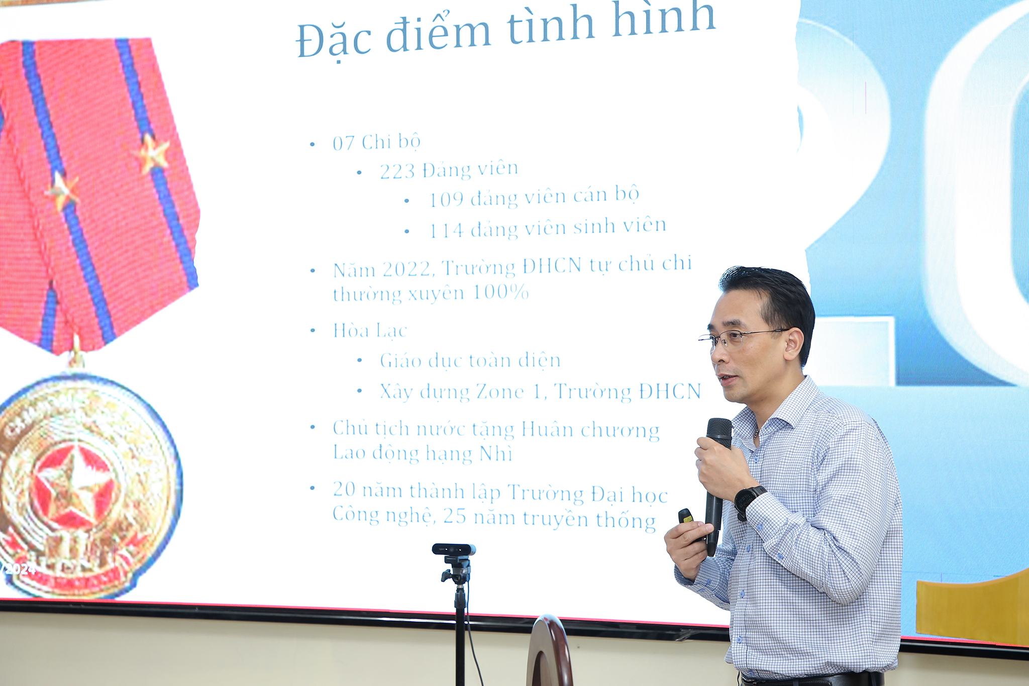 Tại hội nghị, GS.TS. Chử Đức Trình – Phó Bí thư Đảng ủy, Hiệu trưởng Nhà trường đã trình bày tóm tắt báo cáo kết quả công tác Đảng 6 tháng đầu năm 2024 và phương hướng nhiệm vụ 6 tháng cuối năm 2024. Trong phần báo cáo, Phó Bí thư Đảng ủy đã tổng kết những thành quả của sự nỗ lực của Đảng bộ và của Nhà trường trong thời gian qua. Năm 2024 là năm kỷ niệm 20 năm ngày thành lập, 25 năm ngày truyền thống Trường ĐH Công nghệ và trong bối cảnh thực hiện cơ chế tự chủ kinh phí chi thường xuyên, nhưng Nhà trường vẫn đạt nhiều thành tích trong công tác đào tạo, người học; hoạt động khoa học và công nghệ; công tác tổ chức cán bộ; đảm bảo chất lượng.