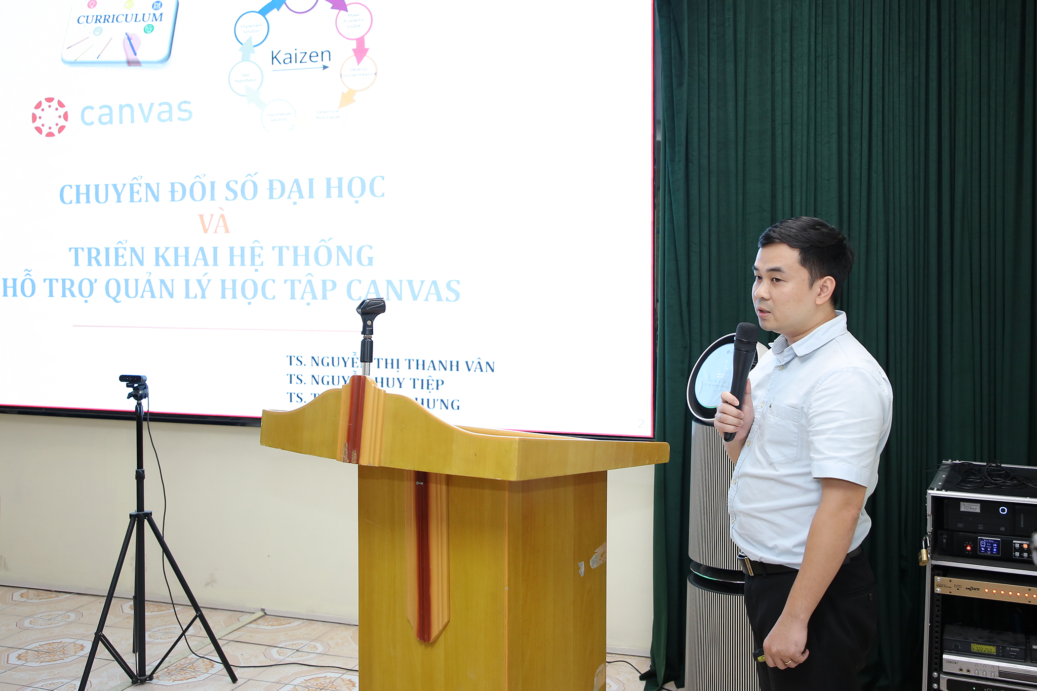 Hội nghị tiếp tục lắng nghe báo cáo chuyên đề với nội dung “Thực hiện chuyển đổi số đại học và triển khai hệ thống hỗ trợ quản lý học tập Canvas” do TS. Trần Cường Hưng – Phó Giám đốc Trung tâm Đảm bảo chất lượng. Báo cáo chia sẻ về khái niệm chuyển đổi số trong giáo dục đại học là quá trình tích hợp công nghệ số và các phương pháp giáo dục hiện đại vào mô hình giáo dục truyền thống để cải thiện chất lượng và hiệu suất công việc. Dựa trên những đánh giá của các đoàn chuyên gia đánh giá ngoài các chương trình đào tạo, TS.Trần Cường Hưng đã phân tích các tiêu chí, tầm quan trọng của chuyển đổi số nói chung và tại UET nói riêng trong quản trị đại học với việc tổ chức học phần trên Canvas LMS. Từ đó, Trường ĐH Công nghệ sẽ nâng cao việc tổ chức, quản lý các hoạt động dạy học thuận tiện, hiệu quả; đa dạng các hình thức học tập, cá nhân hóa; tiếp cận nguồn học liệu lớn, đa dạng; tăng cường sự chủ động, tích cực trong học tập của sinh viên và giảng viên.