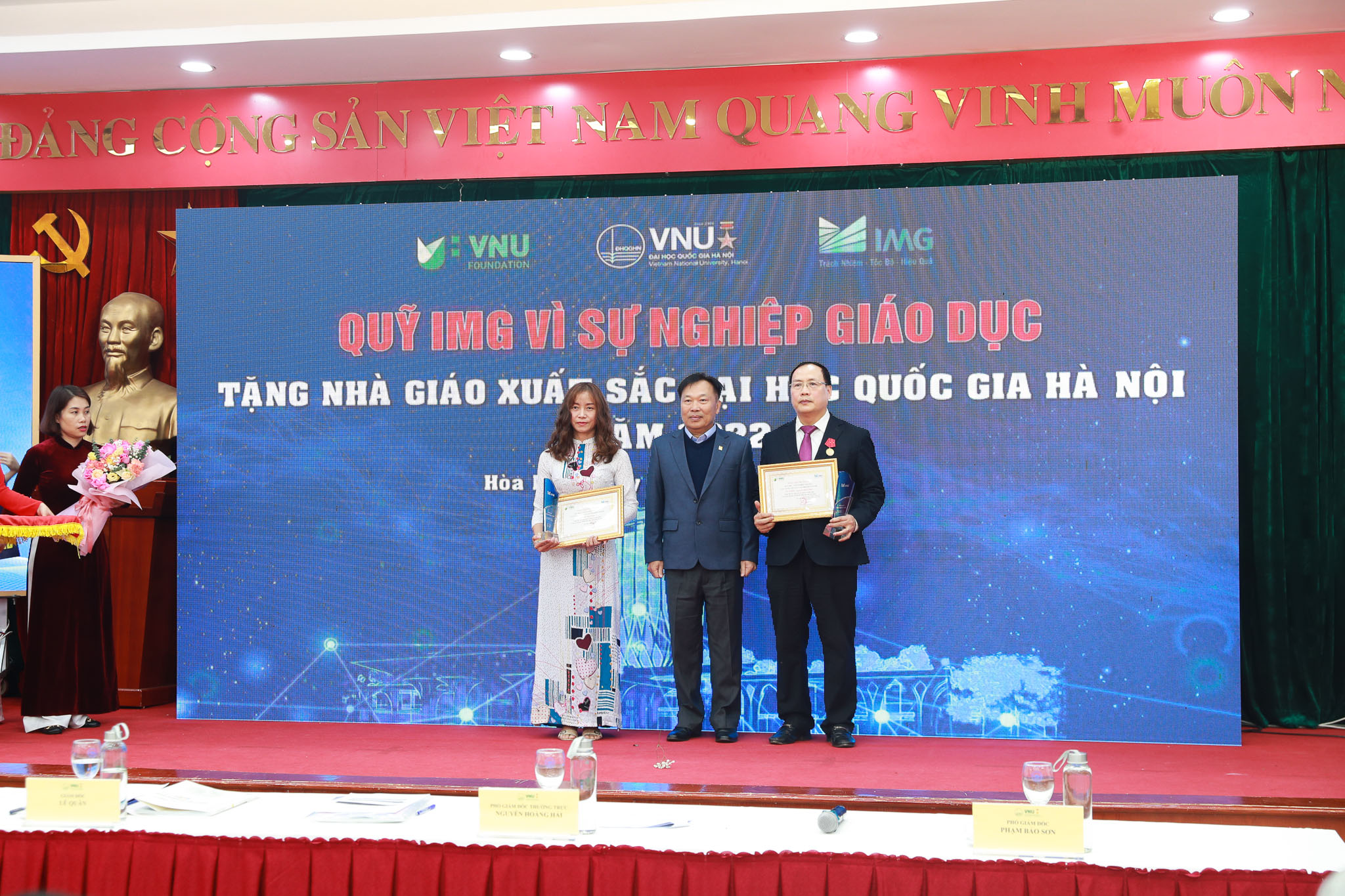 GS.TSKH Nguyễn Đình Đức (ngoài cùng bên phải ảnh) và TS. Ma Thị Châu (ngoài cùng bên trái ảnh) đạt Giải thưởng Nhà giáo tiêu biểu ĐHQGHN năm 2022
