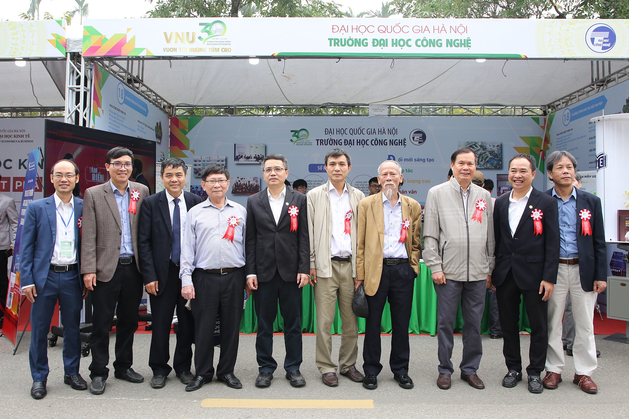 GS.TS. Nguyễn Hữu Đức (hàng trước, thứ 4, từ trái sang) – Nguyên Phó Giám đốc ĐHQGHN, Chủ tịch Hội đồng Khoa học và Đào tạo Trường Đại học Công nghệ, ĐHQGHN và PGS.TS Nguyễn Ngọc Bình (hàng trước, thứ 5, từ trái sang) – Nguyên Bí thư Đảng ủy, Nguyên Hiệu trưởng Trường ĐH Công nghệ, ĐHQGHN tham quan gian trưng bày của Trường.