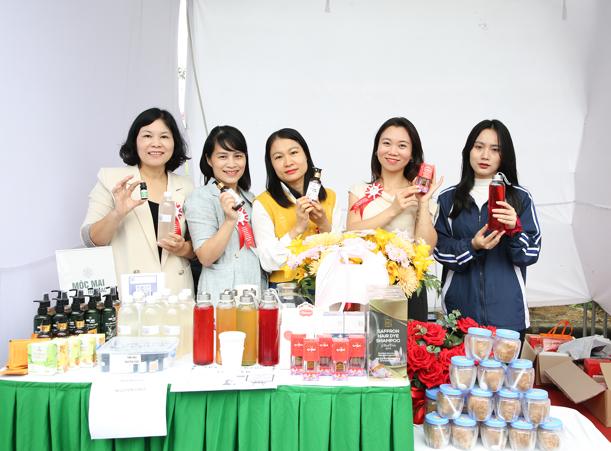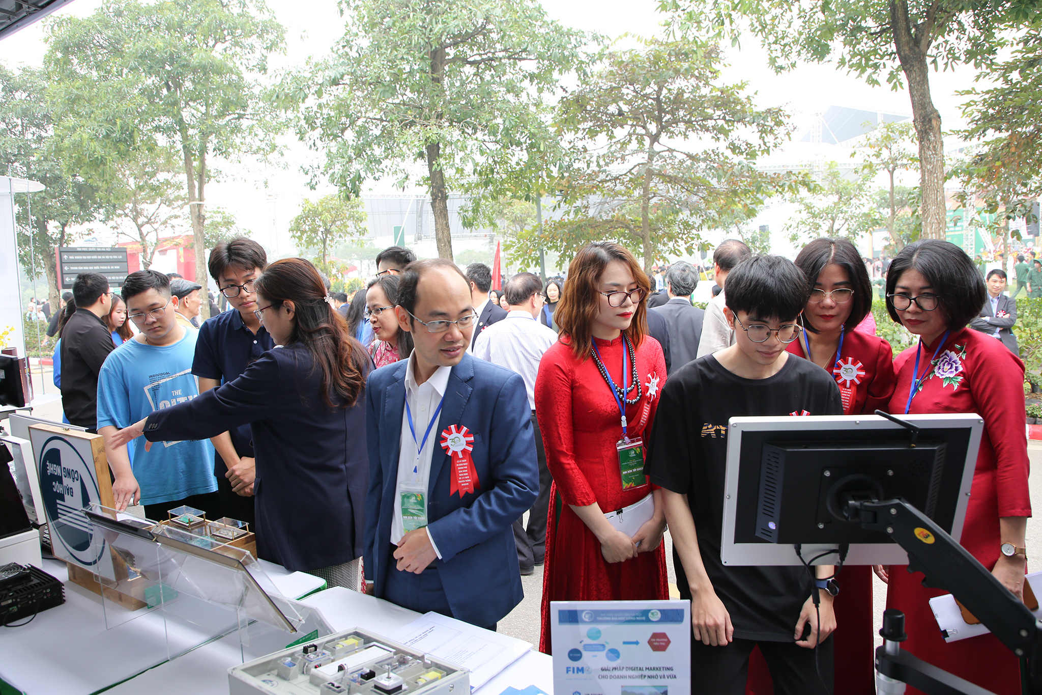 Ban giám hiệu, cán bộ, giảng viên và sinh viên Trường ĐH Công nghệ tại gian trưng bày sản phẩm tiêu biểu của Nhà trường