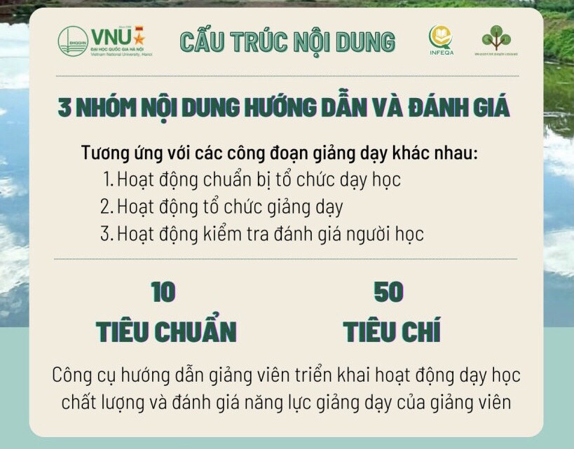 Khung năng lực giảng dạy được thiết kế vừa như một công cụ hướng dẫn thực hành giảng dạy xuất sắc, vừa có thể sử dụng như một công cụ tham chiếu trong đánh giá hoạt động dạy học của giảng viên. Đây là một công cụ quan trọng để đảm bảo chất lượng giảng dạy và học tập trong bối cảnh giáo dục đại học. Nội dung hướng dẫn và đánh giá sẽ được áp dụng trong tất cả các công đoạn của hoạt động dạy học, bao gồm: Chuẩn bị hoạt động dạy học; Tổ chức giảng dạy; Kiểm tra đánh giá người học. Các nội dung này được thể hiện qua 10 tiêu chuẩn và 50 tiêu chí đánh giá năng lực giảng dạy. Tương ứng với mỗi tiêu chí, Khung năng lực giảng dạy đề xuất các chỉ báo để phục vụ đánh giá hoạt động dạy học của giảng viên.