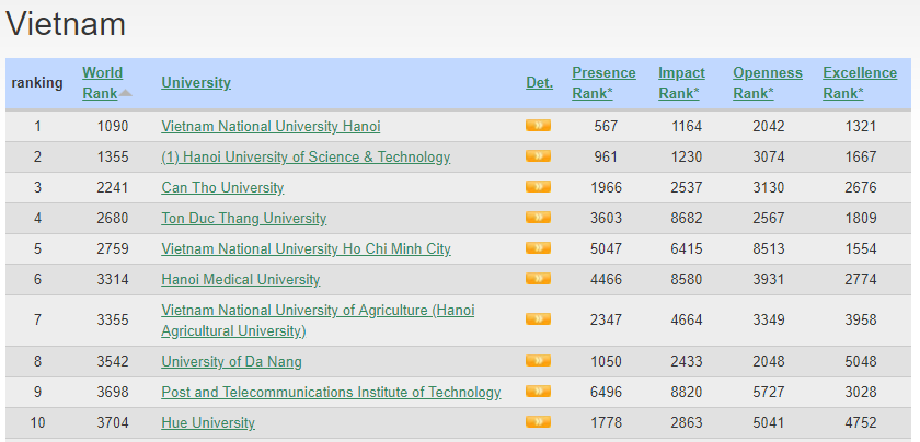 Các trường đại học của Việt Nam tiếp sau ĐHQGHN là Trường ĐH Bách khoa Hà Nội, ĐH Cần Thơ và Trường ĐH Tôn Đức Thắng (thứ hạng lần lượt là 1355, 2241 và 2680). ĐHQGHN có tiêu chí Tác động (Impact), Độ mở (Openess) và “Xuất sắc” (Excellence) tốt nhất trong số các cơ sở giáo dục đại học của Việt Nam.