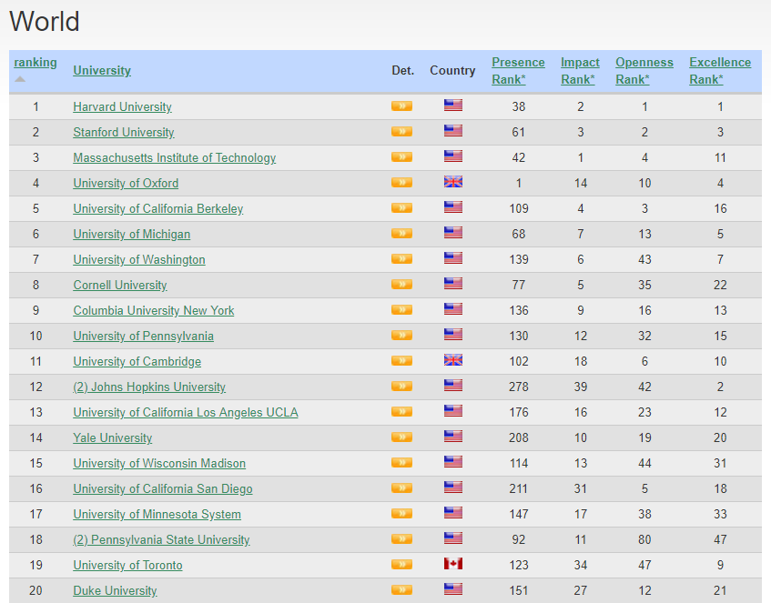 Tốp 20 các cơ sở giáo dục thế giới của Webometrics tháng 1/2019
